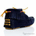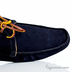 Необычные мужские мокасины из роскошной синей замши от Kurt Geiger. Желто-коричневый шнурок, который используется в качестве застежки, а также украшает край обуви, смотрится на основном фоне ярко и выигрышно. Верх отделан длинной бахромой, задник украшен контрастными вставками.