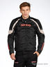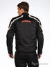 Мотокуртка выполнена из плотной непродуваемой ткани с пропиткой. Синтепоновая подкладка отстегивается. На локтях, плечах и спинке композитные защитные вставки. По спинке и передней полочке изделия проходят синтепоновые вставки. Воротник-стоечка. Втачные карманы на молнии на внешней части изделия. На полочке, рукавах и спинке изделия вставки из перфорированной ткани. На рукавах молнии и хлястики на липучке, регулирующиеся по длине. По бокам изделия хлястики на липучке. Застежка на молнию и липучку.