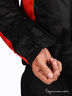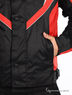 Мотокуртка выполнена из плотной непродуваемой ткани с пропиткой. Синтепоновая подкладка отстегивается. На локтях, плечах и спинке композитные защитные вставки. Синтепоновые вставки на спинке. По низу изделия проходит синтепоновое уплотнение. Воротник-стоечка. В подкладке втачной карман на липучке и карман на резинке (для телефона). Втачные карманы на молнии на внешней части изделия. На рукавах молнии и хлястики на липучке, регулирующиеся по длине. По бокам изделия хлястики на липучке. Застежка на молнию, кнопки и липучку.