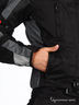 Мотокуртка выполнена из плотной непродуваемой ткани с пропиткой. Синтепоновая подкладка отстегивается. На локтях, плечах и спинке композитные защитные вставки. Воротник-стоечка. Втачные карманы на молнии на внешней части изделия. На рукавах молнии и хлястики на липучке, регулирующиеся по длине. На подкладке два кармана на молнии и карман на липучке для телефона. Внизу изделия хлястики на липучке. Застежка на молнию и липучку.