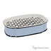 Яркие и необычные по форме предметы изготовлены из керамики и украшены изящным орнаментом в виде решетки. Низ предметов акцентирован широкой голубой полосой. Орнамент повторяется на шторке, коврике и жаккардовых полотенцах.