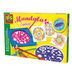 Специальная рамка-фиксатор предназначена для того, чтобы закрепить трафарет на листе бумаги и создавать узоры, поворачивая трафареты по кругу. В набор входят 2 трафарета, основа, бумага и карандаши 6 цветов.