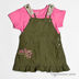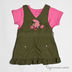 Великолепный набор-двойка имеет очень выразительное цветовое сочетание. Состоит из маечки приятного розового цвета с круглым вырезом и короткими рукавами и сарафана зелёного цвета на клёпках, декорированного красивыми вышивками спереди и сзади. Сарафан имеет два передних и два задних кармашка. Снизу присобраны рюши.