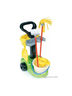Если вашей девочке уже исполнилось три годика, то ей можно подарить отличный набор с названием "Хозяюшка". С ним она почувствует себя настоящей хозяйкой, повторяя за мамой все приёмы по уборке помещения. В комплекте имеется довольно интересная тележка с основанием на колёсах в нижней части, на которой имеются специальные углубления для размещения всех предметов. Передвигается тележка за удобную ручку, на которой с тыльной стороны прикреплена ярко-жёлтая корзинка для мелочей. Сам ручка чёрная, а основание тележки - салатового цвета. В наборе также есть швабра со щёткой, которые можно вешать за петельки на гвоздик или вообще снять с них палки по необходимости. Имеется и совок. И главное - ведёрко для воды, у которого есть механизм отжима.