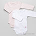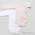 Модели с длинным рукавом. Классическая застежка-боди на кнопках в шаговом шве. Застежка на кнопках на полочке по всей длине изделия. Одна модель простая розовая. Вторая - с множеством мелких принтов.