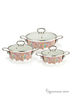 Набор эмалированных кастрюль 6пр.; кастрюли 2.8л, 20х11см; 4.9л, 22х15см; 3.6л, 24х9см; углеродистая сталь; эмалированное покрытие; 3 стеклянные крышки; индукция. Размер: 32x24,5x52,5 см.