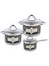 Набор кастрюль 18см(2.5л), 20см(3л) и соусник 16см(1.5л) с крышками Коллекция Fiore. Материал нержавеющая сталь, толщина стенок 0,5мм. 5- слойное капсульное энергосберегающее дно(4мм) служит для равномерного распределения тепла по всей площади посуды. Подходит для всех типов нагревательных поверхностей, включая индукционные. Удобные ненагревающиеся ручки существенно облегчают процесс приготовления блюд. На внутренних стенках посуды нанесена маркировка литража. Стеклянные крышки с отверстием для выпуска пара. Стильный жаростойкий рисунок на внешних стенках посуды.