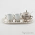 Кофейный набор на две персоны. Овальный поднос украшен цветочным орнаменом. Сахарница на изящной ножке с рельефным рисунком, изображающем розы, в комплекте с ложечкой. Фаянсовые чашки в ажурных подстаканниках. Все металлический детали покрыты сплавом серебра и никеля. Этот сервиз станет еще одним поводом для встречи с другом за чашечкой кофе.