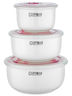 Размеры контейнеров: 15Х8, 13,5Х7, 10,5Х6. Объем 0,85 л, 0,6 л, 0,25 л. Контейнера изготовлены из высококачественной керамики, благодаря этому не впитывают запахи и легко моются. Вакуумная крышка выполнена из ABS-пластика и оснащена клапаном, имеющим механизм для удаления воздуха, а также отметки месяцев для контроля срока годности продуктов. Универсальность хранения - подходит для хранения сыпучих продуктов и готовых блюд. Использование изделия в духовом шкафу и микроволновой печи разрешено без крышки. Можно мыть в посудомоечной машине.