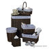 Этот декоративный и одновременно функциональный набор корзин из 6-ти предметов изготовлен вручную из ивовых прутьев. Набор обеспечивает хранение всех необходимых мелочей в ванной или гардеробной комнате. Все корзины имеют съемные хлопковые чехлы, которые можно стирать. Все предметы упакованы в одну упаковку с удобной ручкой для переноски. Набор состоит из следующих предметов: 3-х секционной корзины с ручкой (28х26х14 см.), прямоугольной корзины с крышкой (53х43х32 см.), большой (18х36х27 см.) и маленькой (15х29х22 см.) корзин, корзины для мусора (28х26х26 см.) и бокса для бумажных салфеток(15х15х15 см.).