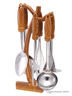 Набор кухонных принадлежностей. Состав набора: шумовка, картофелемялка, венчик для взбивания, половник, вилка, гарнирная ложка, пластиковые ручки стилизованные под дерево, пластиковая вертикальная подставка.