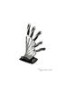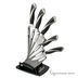 1 нож "шеф повара" - толщина лезвия 3 мм., 1 нож для хлеба волнистое лезвие 3 мм., 1 нож для мяса - толщина лезвия 3 мм., 1 универсальный нож - толщина лезвия 2,0 мм., 1 нож для чистки овощей - толщина лезвия 2,0 мм., 1 акриловая подставка.
