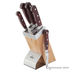Лезвия Ножей из нержавеющей стали толщиной 3.0 - 2.5 мм. Высокая степень полировки поверхности стали для долгой службы. Можно мыть в посудомоечной машине. 5 ножей из специальной стали, 1 деревянная подставка.