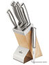 Лезвия Ножей из нержавеющей стали толщиной 3.0 - 2.5 мм. Высокая степень полировки поверхности стали для долгой службы. Можно мыть в посудомоечной машине. 5 ножей из специальной стали, 1 деревянная подставка.