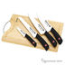 20см/2.0мм нож поварской, 20см/2.0мм нож хлебный, 17см/2.0мм нож сантоку, 9см/1.5мм нож для чистки и резки, 34х22х1.8см доска разделочная. Лезвия с покрытием Non-Stick (не допускает прилипания).