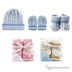 Очень стильный вязаный набор, из трех предметов: шапочка, пинетки и рукавички. Связанные из мягкого и тёплого акрила, вещи упакованы в прозрачный подарочный бокс. Идеально подходит в качестве подарка для малыша. 3 цветовые вариации.
