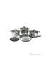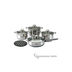 Пятислойное капсульное дно. Нержавеющая сталь. Стеклянная крышка. Состав: кастрюля, сковорода. Жаропрочная подставка.