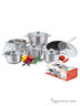 Набор 12 предметов. Высококачественная нержавеющая сталь 18/10. 5ти-слойное капсульное дно. Зеркальная полировка. Можно использовать на всех типах плит включая индукционную. Стеклянные крышки с паровыпуском. Удобные клепаные ручки не нагреваются. Посуда пригодна для мытья в посудомоечной машине.