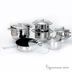 12 предметов: ковш 2.0л, кастрюли 2.0л, 2.5л, 3,5л, 5.5л, сковорода 2.0л диаметр 25см, крышки стеклянные. Нержавеющая сталь. Сковорода с антипригарным покрытием. Ручки металлические