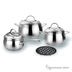 кастрюля с крышкой Ø20см (4,8 л), кастрюля с крышкой Ø18см (3,2 л), сотейник с крышкой Ø16см (2,1 л), черная бакелитовая подставка. Многослойное термоаккумулирующее дно, крышки комбинированные: нержавеющая сталь 18/10 и термостойкое стекло, ручки литые из нержавеющей стали 18/10, способ крепления ручек на клепках, матовая полировка.