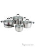 8 пр.: 3 кастрюли :2,7л(18см), 3,7л(20см), 5,8л(24см), ковш 1,2((14см), крышки стекл., ручки из нержав. стали с силиккон покрытием, стенки 0,7мм, капсулир. дно, поверхность зерк. с тремя матов. полосами. Состав: нержав. сталь.