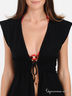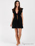 Оригинальная пляжная накидка из эластичного хлопкового материала. Проймы и низ изделия обработаны оверлоком, горловина и передняя часть окантованы трикотажной лентой. Пояс дополнен нашивкой, посажен на многорядную резинку. Спереди завязки.