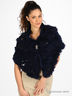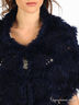Накидка оригинальной ажурной вязки декорирована продетыми вставками из кроличьего меха.