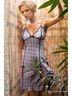 Ночная сорочка до уровня колен полуприлегающего силуэта выполнена из натурального шёлка. Спереди под грудью фигурные подрезы, подчеркнутые однотонными кантами, заканчивающиеся по центру груди бантиком. V-образный вырез горловины. От верхнего угла чашки до низа изделия проходят два симметричных рельефа с отделочными кантами. Рельефы заканчиваются разрезами, украшенными бантиками. Сорочка на тонких регулирующихся бретелях с открытой спинкой.