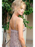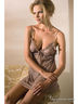 Ночная сорочка выше уровня колен выполнена из мягкой вышитой сетки. Треугольные чашки с настроченными по краям рюшами. Под грудью так же настрочены рюши. Сорочка имеет плотное прилегание по фигуре под грудью благодаря мягкой резинке, настроченной изнутри. К низу сорочка расширяется. Сзади открытая спинка с прямым вырезом, поддерживается на тонких регулирующихся бретелях.