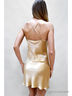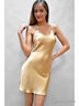 Короткая ночная сорочка полуприлегающего силуэта выполнена из натурального шёлка. Спереди имеются горизонтальные нагрудные вытачки. Закруглённый вырез горловины в верхних углах у бретелей украшен бантиками. Тонкие бретели регулируются. Спина открытая.