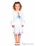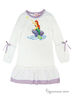 Слегка расклешенная ночная сорочка с длинным рукавом. Часть рукава и подол юбки в декоративную сборку. Рукава украшены бантиками. Декоративная аппликация на полочке.