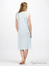 Батистовая ночная сорочка нежно-голубого цвета в диагональную полоску. Круглая горловина. На полочке планка-застежка на пуговицах декорирована вязаным кружевом и атласной лентой в тон.