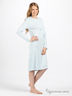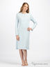 Длинная трикотажная ночная сорочка расклешенного покроя нежно-голубого цвета с очаровательной перфорацией в виде сердечек. Круглая горловина окантована ажурной тесьмой. На полочке планка-застежка на пуговицах. Рукава и подол обработаны оверлоком, что придает сорочке особую женственность.