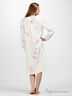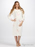 Длинная трикотажная ночная сорочка из приятного на ощупь материала. Выполнена в нежном кремовом цвете с нежным цветочным принтом. Фигурный вырез горловины. Планка-застежка с перламутровыми пуговицами. Кокетка выделена тюлевой вставкой с атласной вышивкой. Длинные рукава с манжетами на пуговицах.