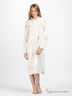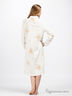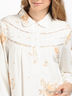 Длинная трикотажная ночная сорочка из приятного на ощупь материала нежного кремового цвета с принтом "чайная роза". Отложной воротник с закругленными краями. Планка-застежка на пуговицах. Полочка украшена кружевными вставками и атласной лентой с бантиком. Длинные рукава с манжетами на пуговицах.