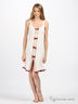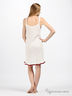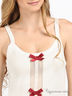 Стильная и удобная ночная сорочка из трикотажа "лапша" молочного цвета. Тонкие бретельки. Спереди ажурная вставка, украшенная бордовыми бантиками. Небольшой разрез. Подол окантован атласной лентой.