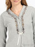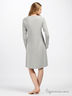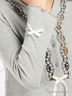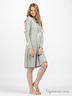 Длинная трикотажная сорочка из трикотажа в рубчик светло-серого цвета. V-образная горловина. Планка-застежка на пуговицах. Полочка декорирована черной тюлью с белой вышивкой. Длинный рукава декорированы бантиками.
