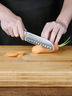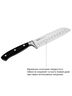 Нож Сантоку предназначен для шинковки овощей, тонкой нарезки, разделки мяса и рыбы. Углубления на поверхности облегчают использование: в них при нарезке остается воздух, поэтому продукты не налипают на лезвие.