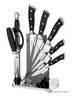 8пр. Топорик 32(17)см, ножи: поварской 34,6(20)см, для тонкой нарезки 34,2(20)см, универсальный 23,4(12,5)см, для очистки 19,3(8,75)см, мусат 31,4см, ножницы 24см. Лезвие 2-3мм, ручка из пластика с нержав. сталью. Подставка из нержав. стали, акрила и пластика. Состав: нержав. сталь.