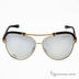 Эффектные солнцезащитные очки в тонкой металлической оправе золотистого оттенка. Оригинальный дизайн мостика дополнен косичками из черной кожи на верхней части рамки. Изящные пластиковые заушники с принтом украшены металлическими вставками у основания и на наконечнике. Ударопрочные зеркальные линзы каплевидной формы серого оттенка.
