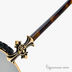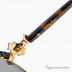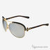 Эффектные солнцезащитные очки в тонкой металлической оправе золотистого оттенка. Оригинальный дизайн мостика дополнен косичками из черной кожи на верхней части рамки. Изящные пластиковые заушники с принтом украшены металлическими вставками у основания и на наконечнике. Ударопрочные зеркальные линзы каплевидной формы серого оттенка.