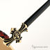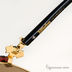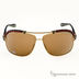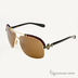Эффектные солнцезащитные очки в тонкой металлической оправе золотистого оттенка. Оригинальный дизайн оправы и мостика дополнен косичками из черной и красной кожи на верхней части рамки. Изящные пластиковые заушники украшены металлическими вставками у основания и на наконечник. Ударопрочные линзы коричневого оттенка.