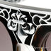 Стильные и изящные солнцезащитные очки в оправе из пластика. Верхняя часть рамки декорирована металлической вставкой с узорами. Внутренняя сторона рамки с перламутровым напылением. Оригинальное дизайнерское решение в виде металлической рельефной вставки у основания заушника. Наконечник слегка изогнутой формы, выполнен из полупрозрачного пластика с напылением изнутри и декорирован маленькой вставкой. Линзы из высококачественного пластика, темно-серого цвета.