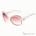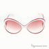 Эффектные солнцезащитные очки с пластиковой рамкой белого цвета с окантовкой красного цвета в форме бабочки. Линзы розового оттенка с градиентом. Заушники из белого пластика с крсной окантовкой, широкие у основания, заужаются к наконечникам. Основание заушника декорировано вставкой с изображением логотипа марки. Пружинный механизм раскрытия заушников позволяет с удобством и комфортом одевать и снимать очки.