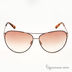 Трендовые солнцезащитные очки в модной металлической оправе. Рамка каплевидной формы. Двойной тонкий мостик. Основание заушников дополнено маленькой вставкой в виде логотипа бренда. Заушники выполнены из металла. Наконечник из пластика с принтом. Линзы светло-желтого цвета с градиентом.