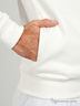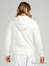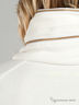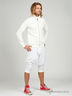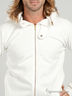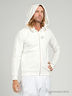 Стильная олимпийка из белого футера с большим капюшоном, спрятанным в воротнике. Застегивается на молнию. Длинный прямой рукав и низ изделия на трикотажной резинке в мелкий рубчик. Два врезных кармана.