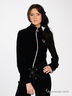 Эластичная бархатная олимпийка свободного покроя. Воротник стойка. Застегивается спереди на металлическую молнию. Длинные рукава с манжетами. Низ изделия посажен на кулиску. Спинка декорирована серебристой вышивкой и стразами.