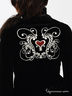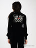 Эластичная бархатная олимпийка свободного покроя. Воротник стойка. Застегивается спереди на металлическую молнию. Длинные рукава с манжетами. Низ изделия посажен на кулиску. Спинка декорирована серебристой вышивкой и стразами.