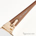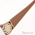 Изящная медицинская оправа из тонкого металла золотого цвета. Боковые части рамки дополнены стильным орнаментом. Заушники выполнены из глянцевого пластика серо-перламутрового цвета. Наконечник слегка изогнутой формы.