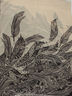 Палантин черно-серый с бежевым оттенком из полиэстера, очень широкий с растительным принтом. Края палантина обработаны машинной строчкой. Размер: 120х160 см.